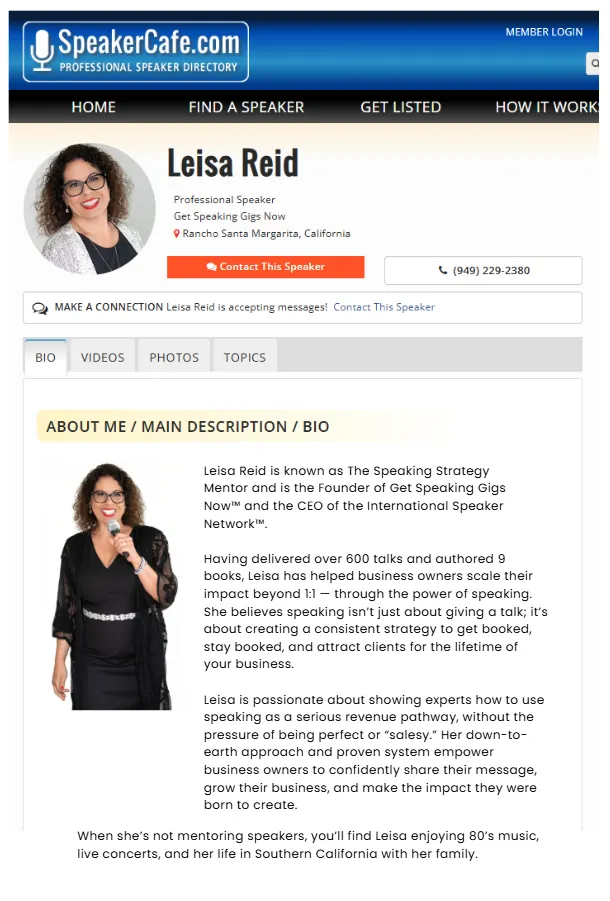 Check out Leisa's SpeakerCafe listing and see what a profile listing looks like, the categories you can align yourself with, in addition to the content you can display to help attract potential companies and organizations to book you to speak, the next question is, what can you do with your SpeakerCafe directory profile listing? Well, here are all the ways you can use your SpeakerCafe.com directory profile listing: